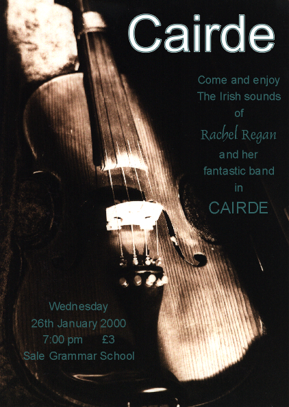 That autumn, Rachel began an art foundation course at MMU and met more budding musicians: Rory Geraghty, an Oldham born fiddler, born to Irish parents, and Rob Mager, a vocalist/guitarist from near Rochdale, fresh out of a rock/indie band. They were eager to form a new band, including Phil. Once the new band was formed, they quickly came up with two full sets of music, comprising original compositions, old favourites, and folk songs and tunes. The band then decided on a name: 'Cairde,' pronounced something like 'corr-sha,' which means 'friends' in Irish (Gaelic).